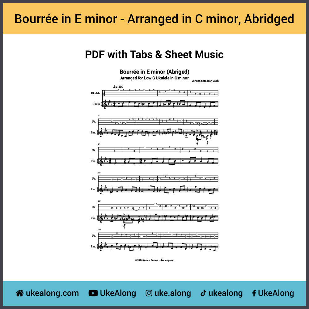 PDF file containing sheet music and tablature for the melody of Johann Sebastian Bach's classical composition "Bourrée in E minor" in an abridged format. This arrangement transposes the original work from E minor to C minor, specifically adapted for low G ukulele tuning. The notation includes both standard musical notation and ukulele tablature, providing players with a clear reference for performing this adaptation of Bach's composition.