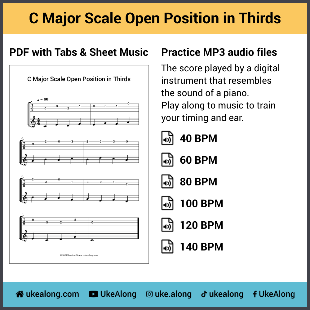 The C major scale is probably the most widely used scale in modern popular music. Learn it in the standard sequence (C, D, E, F, G, A, B, C) first and then in variations such as using thirds. It sounds more interesting and musical like that and is helpful for improvisation because chords are built with third intervals.