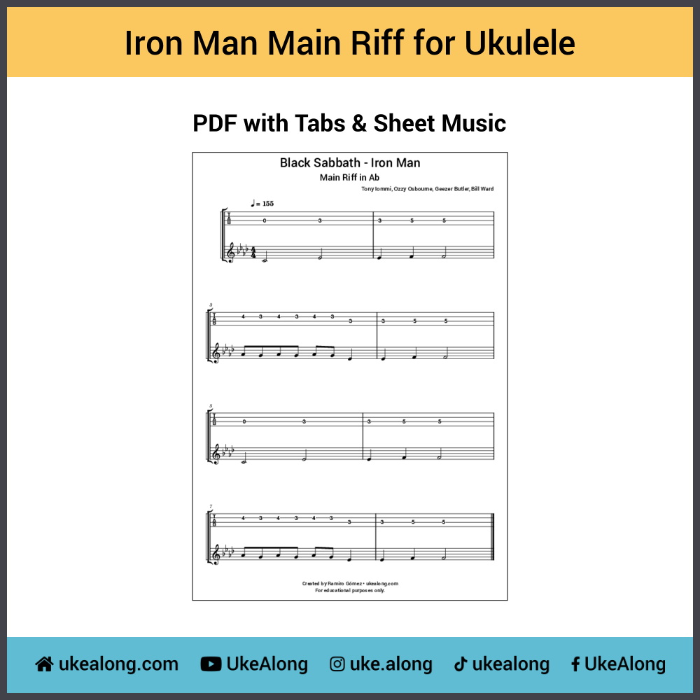 Sheet music and tabs in PDF format for the main riff of the classic heavy metal song Iron Man by Black Sabbath. It is transcribed for ukulele in GCEA tuning and can be played like that with linear (low G) and re-entrant (high G) tuning. Click through the slides above for the play along video to hear how it sounds played on an ukulele.