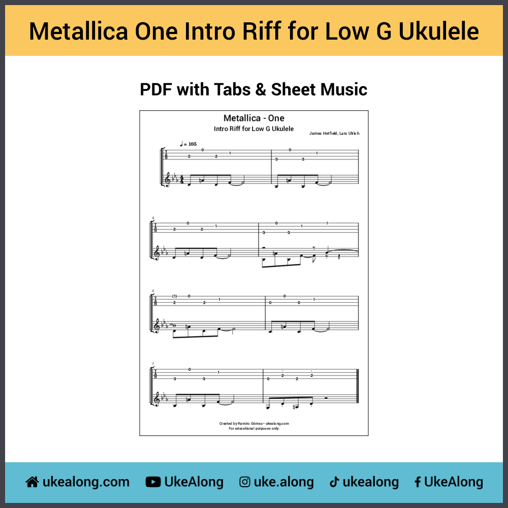 Sheet music and tabs in PDF format for Metallica's intro riff to the song One from the 1988 album "...And Justice for All". Click through the slides above for the play along video to hear how it sounds played on an ukulele. A cool sounding and simple riff to practice finger picking and alternating between thumb and index and middle fingers on the picking hand.