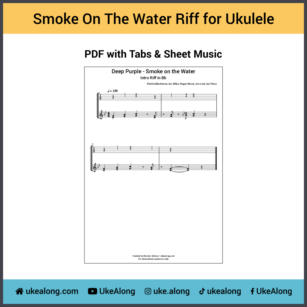 Sheet music and tabs in PDF format for one of the most iconic guitar riffs ever, the intro to the rock song Smoke On The Water by Deep Purple. It is transcribed for ukulele in GCEA tuning. It is in the key of the original song and can be played along to it with linear (low G) and re-entrant (high G) tuning. Click through the slides above for the play along video to hear how it sounds played on an ukulele.