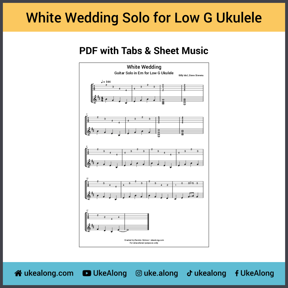 Sheet music and tabs in PDF format for the guitar solo of the Billy Idol song White Wedding transcribed for ukulele in linear GCEA tuning. With a baritone in DGBE tuning you can play along to the original song in this position. Click through the slides above for the play along video to hear how it sounds played on a low G ukulele.